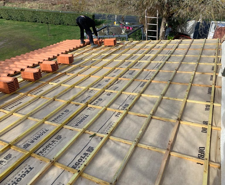 Installation de Toitures : Que vous construisiez une maison neuve ou que vous rénoviez une toiture existante, nous vous offrons une pose de toiture impeccable, adaptée à vos besoins et aux spécificités de votre bâtiment. Nous travaillons avec une large gamme de matériaux de qualité supérieure, tels que les tuiles, ardoises, zinc, ou bacs acier, pour garantir une protection optimale et une longévité accrue.